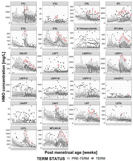 In this study we have compared the content of 22 HMOs of 500 breast milk samples from mothers of preterm infants and term infants over time. The comparison has been performed both by equivalent stage of lactation (postpartum age) or equivalent postmenstrual age (developmental stage).