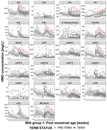 Looking at differences in HMO concentrations at equivalent postmenstrual age, and considering only milk group 1 (Figure 7), does not much change the observations made considering all milk groups (Figure 6) with most of the differences being driven by the stage of lactation. However, it does emphasize the differences in the HMOs containing α-1,2-linked fucose. For example looking at all milk groups, 2′FL concentrations appear significantly different only between weeks 39-41, but when considering only milk group 1 then the concentration differences are significant between weeks 39-43 and at week 45. Similar phenomena can be observed for LNFP-I and LNDFH-I. This highlights the importance of considering milk group when making comparisons between different milk samples.