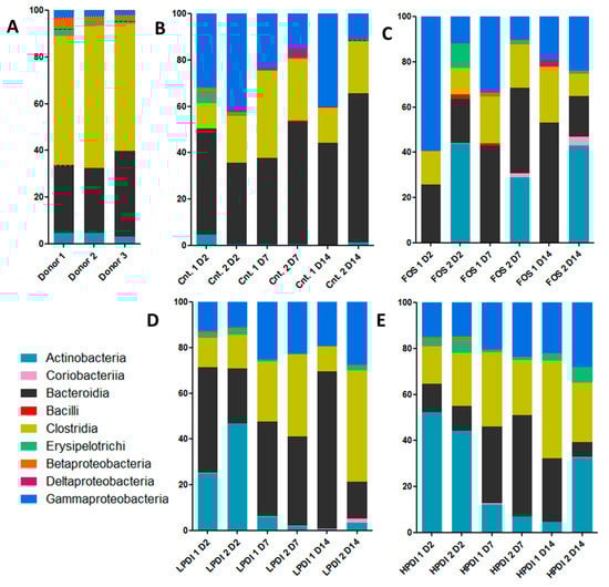 Representation of relative abundance to the class level from the initial time, day 2 (D2), day 7 (D7), and day 14 (D14). Assays were: (A) Sample donors; (B) Controls (Cnt.); (C) Fructooligosaccharides (FOS); (D) Low-polymerization-degree inulin (LPDI); and (E) High-polymerization-degree inulin (HPDI). Each assay was performed in duplicate.