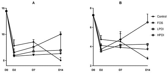 Two indexes to determine diversity were calculated: the exponential Shannon index and the inverse Simpson index, which correspond to Hill numbers 1 and 2, respectively. Broadly similar trends were observed in both indexes (Figure 2). Diversity was markedly reduced on day 2, but tended to stabilization thereafter for most treatments. At the end of the experiment (day 14), HPDI achieved greater recovery of alpha-diversity, given that it almost reached the initial levels as per the inverse Simpson index. LPDI and FOS had lower alpha-diversity, and the control treatment (no prebiotic) resulted in the lowest alpha-diversity on day 14. A two-way ANOVA analysis with Bonferroni correction indicated that the only significant pairwise difference was that of HPDI against the control on day 14 (p < 0.05), while all other pairwise comparisons between groups and days were nonsignificant.