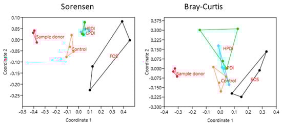 The NMDS analysis revealed a clear closeness between individual donor samples (subsequently pooled as inoculum), but a clear separation between the samples and the microbiotas at days 7 and 14 of ex vivo fermentation, as per both the Sorensen and Bray–Curtis indexes (Figure 4). The Sorensen index clustered together the microbiotas fermented with both the LPDI and HPDI, which were clearly separated from those fermented with FOS or the control medium (no fructan). Conversely, with the Bray–Curtis index, the microbiotas fermented with FOS remained separated, but the LPDI separated further from the HPDI, while becoming closer to the control condition. It is worth noting that sample separation within HPDI in NMDS analysis was markedly larger with the Bray–Curtis index than with the Sorensen one, thus indicating that the variability within HPDI seem to be mostly due to few highly abundant genera.