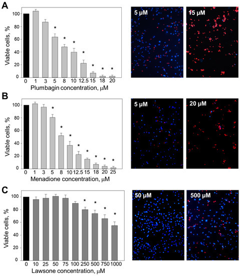 The viability of cells was assessed by measuring their ability to metabolize 3-(4,5-Dimethylthiazol-2-yl)-2,5-Diphenyltetrazolium Bromide (MTT) (as described in [5]) and by a nuclear fluorescent staining assay. In the first experimental series, C6 cells were treated with different concentrations of either plumbagin, menadione, or lawsone for 24 h. Concentrations for plumbagin and menadione were 1 µM, 3 µM, 5 µM, 8 µM, 10 µM, 12.5 µM, 15 µM, 20 µM, and 25 µM and for lawsone were 10 µM, 25 µM, 50 µM, 75 µM, 100 µM, 250 µM, 500 µM, 750 µM, and 1000 µM. In experiments with ascorbate, C6 cells were treated with 5 µM and 15 µM plumbagin, together with 100 µM and 250 µM of ascorbic acid for 24 h. After incubation with 1, 4-naphthoquinones, the cells were double-stained with Hoechst 33,342 (15 µg/mL) and propidium iodide (PI; 5 µg/mL) for 15 min, and the viability was assessed under the fluorescence microscope OLYMPUS IX71SIF-3 (Olympus Corporation, Tokyo, Japan). IC50 was calculated by SigmaPlot 13.0 version (Systat Software Inc., San Jose, CA, USA) software by means of the four-parameter logistic function.