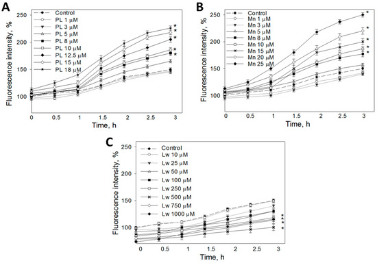The control level of intracellular ROS was determined using appropriate amounts of solvents and the fluorescence intensity in control samples at time point “0” was assumed to be 100%.