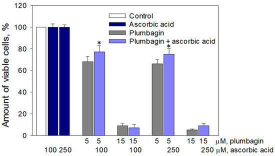 The results previously obtained in this study revealed that the extent of cytotoxicity of 1,4-naphthoquinones correlates with the amount of ROS generated by these compounds, suggesting that ROS might be the key triggers of C6 cell death. To test this hypothesis, we treated C6 cells with plumbagin, which revealed the most potent oxidative and cytotoxic properties (correlation coefficient r = −0.99), together with a classical antioxidant ascorbate. The antioxidant treatment slightly (by 10–14%) prevented cell death induced by 5 µM plumbagin, but did not affect cell death induced by 15 µM plumbagin (Figure 4).