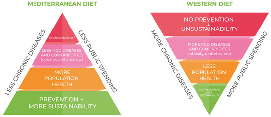 It therefore appears evident that inadequate eating habits now constitute a multilevel problem threatening healthcare sustainability worldwide. In most of the aforementioned studies it is noted that consumer choices turn irremediably towards Western diets, abandoning autochthonous and typical diets. And this indisputable fact entails serious problems for healthcare sustainability [44].