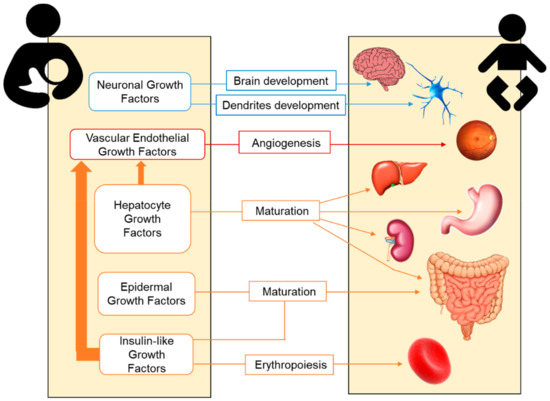 | Growth factors | Main Tissue Synthesized | Range (μg/mL) | Main Neonatal Functions |