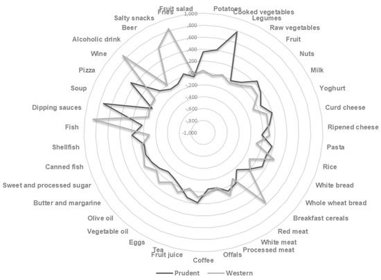 In the whole cohort, the “Western” dietary pattern was characterized by high intake of red meat, fries, dipping sauces, salty snacks and alcoholic drinks. The higher adherence to the Western dietary pattern was associated with decreasing age and percentage of high-educated women (p < 0.001 and p = 0.022, respectively) (Table 2).