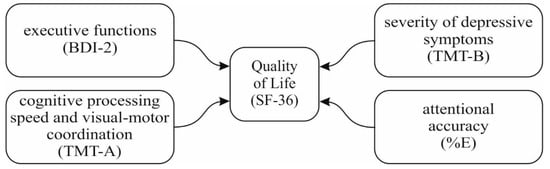 In the case of all regression analyses for the second measurements, as with the first measurements, we had to remove the following variables from the analysis due to collinearity: TN, TN-E, and CP. The final model was as previously presented (Figure 1). The regression analysis with physical functioning as dependent variable revealed that only the severity of depression symptoms (β = −0.42, SE = 0.35, t = −3.22, p < 0.01) was a significant predictor of the quality of life in this aspect (summary of the model: R2 = 0.20, F(4, 51) = 2.10, p < 0.05). As for the second aspect of the quality of life, role limitations due to physical health (summary of the model: R2 = 0.31, F(4, 51) = 5.18, p < 0.01), like before, the severity of depression symptoms (β = −0.40, SE = 0.44, t = −3.26, p < 0.01) and also executive functions (β = −0.35, SE = 0.08, t = −2.76, p < 0.01) constituted important predictors. In the case of bodily pain (summary of the model: R2 = 0.25, F(4, 51) = 3.99, p < 0.01), the only significant predictor was the severity of depression symptoms (β = −0.49, SE = 0.23, t = −3.83, p < 0.01). Similarly, for general health (summary of the model: R2 = 0.33, F(4, 51) = 5.66, p < 0.01), the sole significant predictor was the severity of depression symptoms (β = −0.56, SE = 0.29, t = −4.64, p < 0.01). The same situation occurred for vitality (summary of the model: R2 = 0.39, F(4, 51) = 7.34, p < 0.01; severity of depression symptoms: β = −0.61, SE = 0.33, t = −5.27, p < 0.01) and social functioning (summary of the model: R2 = 0.39, F(4, 51) = 7.60, p < 0.01; severity of depression symptoms: β = −0.45, SE = 0.33, t = −4.84, p < 0.01). In the case of role limitations due to emotional problems (summary of the model: R2 = 0.32, F(4, 51) = 5.43, p < 0.01) the severity of depression symptoms (β = −0.43, SE = 0.44, t = −3.54, p < 0.01) and also executive functions (β = −0.33, SE = 0.08, t = −2.68, p < 0.01) constituted important predictors of quality of life in this aspect. As for mental health (summary of the model: R2 = 0.49, F(4, 51) = 11.33, p < 0.01) the severity of depression symptoms (β = −0.66, SE = 0.25, t = −6.26, p < 0.01), as well as cognitive processing speed and visual–motor coordination (β = −0.25, SE = 0.15, t = −2.33, p < 0.05) constituted important predictors of quality of life in this aspect. In the case of the physical health component (summary of the model: R2 = 0.39, F(4, 51) = 7.61, p < 0.01), the only significant predictor was the severity of depression symptoms (β = −0.57, SE = 0.24, t = −4.99, p < 0.01). For the mental health component (summary of the model: R2 = 0.56, F(4, 51) = 14.65, p < 0.01), it was the severity of depression symptoms (β = −0.68, SE = 0.24, t = −7.03, p < 0.01), as well as the cognitive processing speed and visual–motor coordination (β = −0.21, SE = 0.14, t = −2.10, p < 0.05) that constituted important predictors of quality of life in this aspect. In the case of the quality of life index (summary of the model: R2 = 0.53, F(4, 51) = 13.23, p < 0.01), the severity of depression symptoms (β = −0.68, SE = 0.21, t = −6.78, p < 0.01), as well as executive functions (β = −0.22, SE = 0.04, t = −2.11, p < 0.05) constituted important predictors of quality of life (in general).