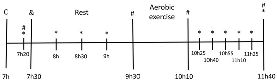 Figure 1. Experimental design of the sessions. (C) Arrival at the laboratory; (*) Blood pressure measurement; (#) Saliva sample collection; (&) Beverage intake.