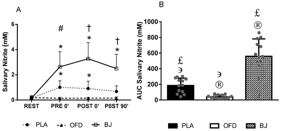Figure 2. Salivary NO2 values from point to point (A) and values for the area under the curve (AUC) (B). Placebo NO3 depleted beetroot juice (PLA); Non-caloric orange flavored drink (OFD); Beetroot juice (BJ). (#) significantly different between all sessions; (†) significantly different when comparing BJ with both PLA and OFD; (*) significantly different when compared to rest (REST); (®) significantly different when compared to PLA; (϶) significantly different when compared to BJ; (£) significantly different when compared to OFD.