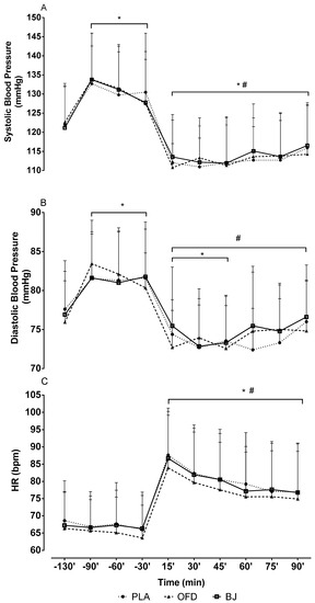 Figure 3. Systolic blood pressure (A); diastolic blood pressure (B) and point-to-point heart rate (C). Placebo NO3 depleted beetroot juice (PLA); Non-caloric orange flavor drink (OFD); Beet juice (BJ). The negative time values refer to measurements before exercise. The positive time values refer to measurements after the exercise. (*) significantly different when compared to the −130′ timepoint (resting pre-ingestion); (#) significantly different when compared to the −90’, −60’, −30’ timepoints (post juice intake).