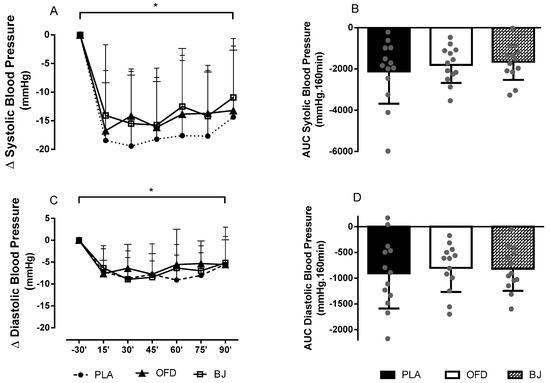 Figure 4. Δ values for systolic blood pressure variation (A) and diastolic blood pressure variation (C), area under the curve (AUC) for systolic blood pressure (B) and for diastolic blood pressure (D). Placebo NO3 depleted beetroot juice (PLA); Non-caloric orange flavor drink (OFD); Beetroot juice (BJ). The negative time values refer to measurements before exercise. The positive time values refer to measurements after the exercise. (*) significantly different when compared to the −30’ point (pre-exercise).