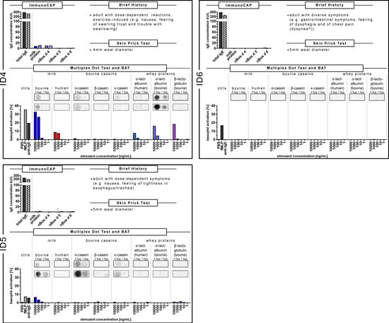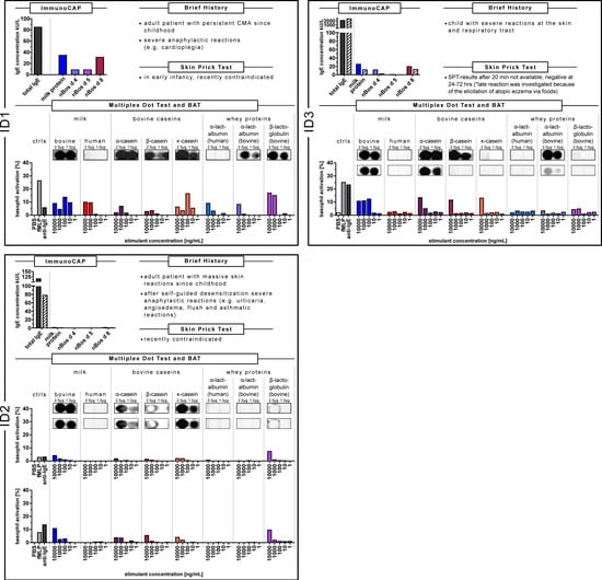 Patients ID1, ID2 and ID3 with severe and anaphylactic reactions to cow’s milk depict a similar sensitization pattern in the CAP-FEIA, the multiplex dot test and BAT (comprised in Figure 1).