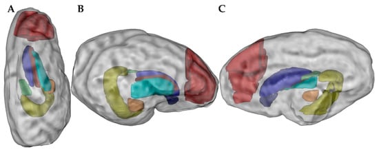 Regions of interest (ROIs) after magnetic resonance imaging presented in top view (A), lateral view (B), and medial view (C), respectively. Measured ROIs: nucleus accumbens (dark blue), caudate nucleus (blue), lentiform nucleus (cyan), fornix (green), hippocampus (yellow), amygdala (orange), prefrontal cortex (red), and internal capsule (burgundy).