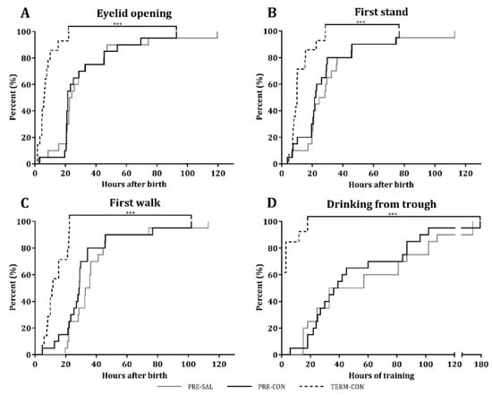 Basic motor skill acquisition. Hours before a given percentage of piglets was observed to open their eyes (A), stand for the first time (B), walk (C), or first voluntarily completion of a full milk bolus from an open trough (D). PRE-SAL (grey line), PRE-CON (black line) and TERM-CON (dotted line). *** PRE-CON and TERM-CON (p < 0.001).