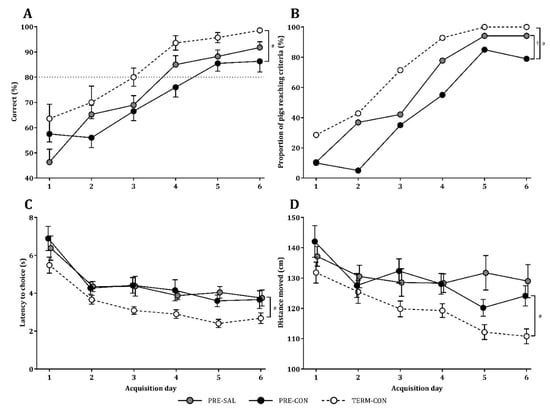 T-maze performance. Average group performances in PRE-SAL (grey), PRE-CON (black) and TERM-CON pigs (dotted line) (A), proportion of pigs reaching the learning criteria of 80% (B), latency to choice (C), and distance moved (D) during the six day acquisition period. There was a significant effect of time in all analyses (p < 0.001). Data are presented as mean ± SEM. † Overall difference between PRE-SAL and PRE-CON (p < 0.05) during the six-day test period; # Overall difference between PRE-CON and TERM-CON (p < 0.01).