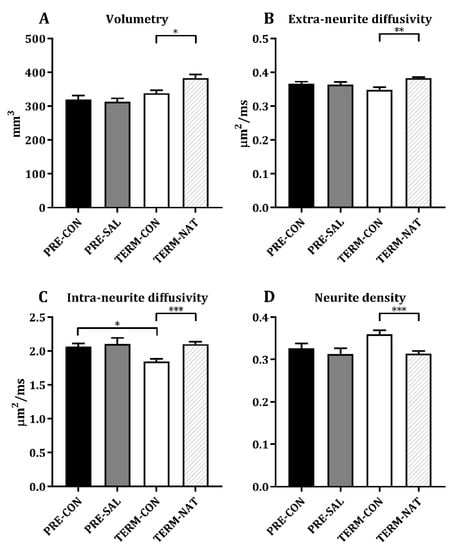 SAL supplementation did not affect the MRI analyses. Previously, changes in diffusivity in corpus callosum have been observed after comparable doses of SAL administration []. Here, MRI scans were only performed on a single hemisphere from each animal; hence, data from corpus callosum could not be obtained. No volumetric differences were observed between PRE-CON and TERM-CON. Reduced volumes in several brain regions, including hippocampus, has been observed in preterm infants [], and their brain diffusivity is associated with age []. The water content decreases during maturation of the human preterm brain []. Changes in water content as well as the development of white and grey matter structures is thought to affect the tissue microstructure, diffusivity, and anisotropic diffusion [,], and the diffusivity of the preterm brain is associated with age []. Preterm infants show lower anisotropy in several white matter structures [,], decreased fractional anisotropy, and increased radial diffusivity in specific white matter regions has been related to cognitive and motor outcomes at 2-year corrected age []. In this study, we observed increased extra-neurite diffusivity for PRE-CON relative to TERM-CON in caudate nucleus, lentiform nucleus, the prefrontal cortex, as well as the internal capsule. Furthermore, the preterm animals had, in general, a higher intra-neurite diffusivity across many of the measured ROIs, but also lower neurite densities relative to the term controls.