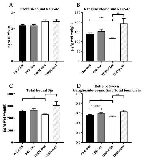 Whereas fortification with sialyllactose did not increase the sialic acid levels in hippocampus of PRE-SAL (Figure 5A–C), there was a tendency toward a higher ratio of ganglioside-bound sialic acid relative to the total bound fraction of sialic acids relative to PRE-CON (p = 0.057, Figure 5D). For the protein-bound fraction of Neu5Gc, PRE-SAL had decreased levels relative to PRE-CON (p < 0.05, Table 2), while similar levels were observed in the ganglioside-bound fraction. Likewise, the total levels of both protein-bound and ganglioside-bound sialic acid did not differ among the preterm groups (Table 2). Relative to TERM-CON, no differences were observed for PRE-CON for the protein-bound fractions of sialic acid. The PRE-CON had higher levels of ganglioside-bound Neu5Ac, as well as the total level of ganglioside-bound sialic acids (both p < 0.001, Figure 5B and Table 2) and the total level of bound sialic acids was higher in PRE-CON relative to TERM-CON (p < 0.01, Figure 5C). The PRE-CON group had a higher ratio between ganglioside-bound and the total bound fraction of sialic acid relative to TERM-CON (p < 0.05 Figure 5D). For term pigs, TERM-CON showed decreased levels of the protein-bound fractions of Neu5Gc relative to TERM-NAT (p < 0.05, Table 2), but similar levels of the protein-bound fraction of Neu5Ac and the total protein-bound level of sialic acid. For all ganglioside-bound fractions, TERM-CON had decreased levels relative to TERM-NAT (all p < 0.01, Figure 5B and Table 2).