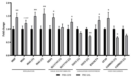 In hippocampus, the expression of genes related to learning and memory, sialic acid and ganglioside metabolism, and neuronal development were assessed. Whereas sialyllactose enrichment did not modify the expression of pre-selected genes involved in memory formation and learning processes (BDNF, NCAM1, NCAM2, GAP43, and others), it changed the expression of eight genes, including those involved in myelination and sialic acid metabolism (Figure 6). The expression level of mRNA encoding for glial fibrillary acidic protein gene (GFAP), the myelination-responsible genes, myelin-associated glycoprotein (MAG), and myelin basic protein (MBP) were upregulated 1.42-fold (p < 0.05), 1.5-fold (p < 0.01), and 1.45-fold (p < 0.01) in the hippocampus of PRE-SAL versus PRE-CON pigs, respectively (Figure 6). The expression of myelin oligodendrocyte glycoprotein (MOG) also tended to be modestly upregulated in the PRE-SAL pigs (1.22-fold increase, p = 0.067). In addition, the genes NEU1, encoding neuraminidase 1 protein, and SLC17A5, encoding Sialin, were upregulated 1.45- and 1.27-fold, respectively (p < 0.05). Moreover, genes involved in ganglioside biosynthesis changed expression for PRE-SAL, i.e., UGCG, encoding UDP-glucose ceramide glucosyltransferase, was downregulated by 39% (p < 0.01), and B3GALT4, encoding beta-1,3-galactosyltransferase 4, was upregulated (1.34-fold increase, p < 0.05). Finally, calcium/calmodulin dependent protein kinase II gamma (CAMK2G) expression in the hippocampus was downregulated by 47% (p < 0.05; Figure 6).
