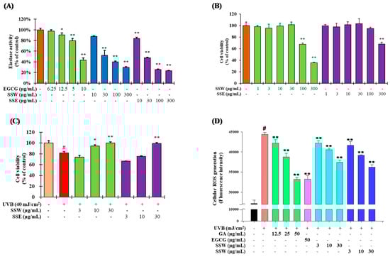 Comparison of anti-aging potential by SS. (A) Inhibitory effects of SS stem extracts on elastase activity. The results are denoted as the mean ± standard deviation (SD) from triplicate experiments (** p ≤ 0.01, * p ≤ 0.05 compared with the control group). (B) Cytotoxicity of SS stem extracts in HaCaT cells. Cells (1 × 105 cells/mL) were seeded in a 96-well plate and treated with aqueous and ethanolic extracts of SS stem (SSW and SSE) at 1, 3, 10, 30, 100, and 300 µg/mL. The cell viability was determined using 3- (4,5-dimethylthiazol-2-yl) -2,5-diphenyltetrazolium bromide (MTT) assay. (C) Phototoxicity of SS stem extracts in HaCaT cells. Cells (1 × 105 cells/mL) were treated with SSW and SSE at 3, 10, or 30 µg/mL. After 24 h, UVB (40 mJ/cm2) was irradiated and the cells were cultured in serum-free medium for 24 h. The cell viability was measured using the MTT assay. The data are denoted as the mean ± SD from triplicate results. (# p ≤ 0.01, compared with the non treated control (NT); ** p ≤ 0.01, * p ≤ 0.05 compared with the UV control group). (D) Reactive oxygen species (ROS) generation activity was measured using HaCaT cells according to the method described in materials and methods. EGCG: (−)-epigallocatechin gallate; GA: gallic acid.