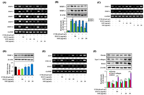 Effects of aging-related biomarkers by SSE. The effects of SSE on the regulation of (A) the mRNA expression and (B) the protein level of MMPs; (C) the mRNA expression and (D) the protein level of tissue inhibitors of matrix metalloproteinases (TIMPs); (E) the mRNA expression and (F) the protein level of elastin (ELN), type I collagen (COL1A1) and hyaluronan synthase 2 (HAS2) induced by UVB (40 mJ/cm2) in HaCaT cells. Cells were cultured for 24 h, and then with the indicated concentration of SSW and SSE for further 12 h. Then the cells were irradiated with 40 mJ/cm2 UVB and cultured for additional 12 h. Reverse transcription-polymerase chain reaction (RT-PCR) and western blot was carried out according to the methods described in materials and methods. The data are denoted as the mean ± SD from triplicate results. (# p ≤ 0.01, compared with the NT; ** p ≤ 0.05, compared with the ultraviolet (UV) control group). EGCG: (−)-epigallocatechin gallate used as a positive control.