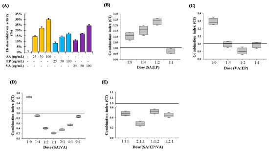 Individual and combination effects of elastase inhibition by the major identified compounds of SSE. (A) Elastase inhibition activity of the major identified compounds of SSE. The results are denoted as the mean ± SD from triplicate experiments. (B–E) Combination effects of elastase inhibition by the major identified compounds of SSE. Combination index (CI) values of <1, =1, and >1 indicate synergism, additive effect, and antagonism, respectively. CI values shown are mean ± SE with a minimum of three experiments. SA: syringic acid; EP: epicatechin and VA: vanillic acid. The raw compuSyn report are given in supplementary data.