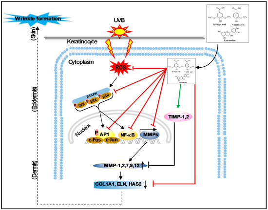 In this study, SS stem extract inhibited the ROS production by UV as well as repressing UV-activated MAP kinase, and ultimately enhanced the expression of COL1A1, ELN and HAS2. The active components, which were identified by HPLC as gallic acid, catechin, vanillic acid, syringic acid, and epicatechin, not only affect protection from ROS and cellular damage, but also inhibition of MMPs, activation of COL1A1, ELN, and HAS2, eventually blocking the phosphorylation of MAPKs and its downstream transcription factor such as AP-1, and NF-κB. These results collectively suggest that Spatholobus suberectus stem extract seems to be valuable as a natural biomaterial that can inhibit UVB-stimulated photo-aging.