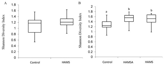 Alpha diversity was calculated in this study, although the study uses an in vitro model (closed system), because changes in diversity can still be observed as the Shannon index combines species richness and their relative abundances. In the preweaning group at 24 h of incubation, there was no significant difference in the Shannon Index between bacterial communities following incubation with HAMS or the controls. For example, at the family level, a one-way ANOVA determined that, in the preweaning group, the overall mean of the log(e) of the Shannon Index did not differ between the control and the HAMS incubations (p = 0.10). The Shannon Diversity Index boxplot based on OTU abundance at the family level is presented in Figure 1A. In the weaning group, at the family level, there was a significant increase in the Shannon index in the RS groups compared to the controls (p = 0.05). However, the type of RS (HAMSA or HAMS) did not have an effect on this measure of diversity. The Shannon Diversity Index boxplot based on OTU abundance at the family level for the weaning infants is presented in Figure 1B.