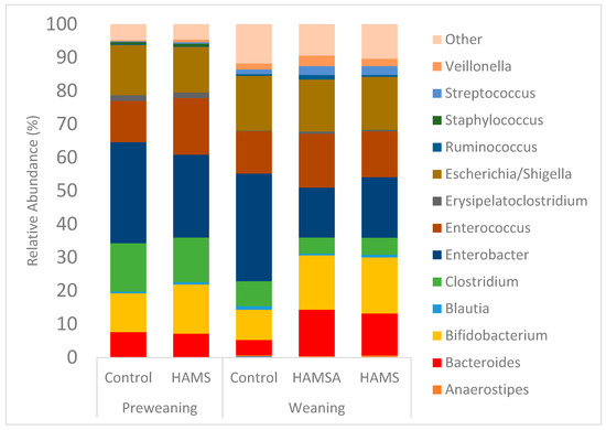 Among the preweaning samples, multivariate analysis did not reveal an effect of HAMS on microbial community structure (p > 0.05). However, in the weaning samples, the effect of both HAMS and HAMSA were significant (p < 0.05), compared to the controls. Pairwise comparison was performed to investigate the differences between the two test groups. This demonstrated that both RSs had a similar effect on community structure (p = 0.97) (see Figure 2). It is apparent that samples from the same individual clustered closely.