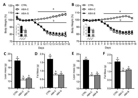 As observed in our previous studies [14,20], there was no significant difference between all groups from day 1 to day 6 (Figure 1A,B). However, once the food access was reduced, body weight significantly decreased in all ABA groups from day 8. At day 17, body weight loss was about 19–22% in ABA-C groups compared to day 6 (p < 0.05). Gln and BCAA supplementation did not affect body weight. ABA groups exhibited altered body composition with a decrease of both lean and fat mass (Figure 1C–F) without Gln and BCAA effects. ABA-C mice exhibited altered physical activity pattern. However, neither Gln nor BCAA supplementation affected physical activity.