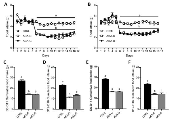 Food intake and cumulative food intake. Food intake was monitored each day, expressed in grams, for both Gln (A) and BCAA (B) series with control mice (CTRL; open circles), non-supplemented activity-based anorexia mice (ABA-C; open squares) and supplemented activity-based anorexia mice (ABA-G or ABA-B; closed squares). Cumulative food intake, expressed in grams, was calculated from day 6 to day 11 and from day 12 to day 16 (supplementation period) for both Gln (C,D) and BCAA (E,F) series. Column bar graphs showed control mice (CTRL; black bars), non-supplemented activity-based anorexia mice (ABA-C; open bars) and supplemented activity-based anorexia mice (ABA-G or ABA-B; grey bars). Values without a common letter significantly differ (p < 0.05). The number of mice was n = 16 for CTRL, n = 16 for ABA-C and n = 12 for ABA-G (A,C,D) and n = 16 for CTRL, n = 16 for ABA-C and n = 14 for ABA-B (B,E,F).