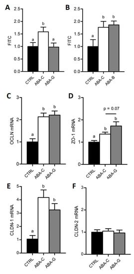 As Gln was able to limit colonic hyperpermeability in ABA mice, we assessed the level of mRNA coding for tight junction proteins in the Gln experiment. Concerning occludin (OCLN), claudin-1 (CLDN-1) and zonula occludens-1 (ZO-1), mRNA levels were increased in the ABA groups compared to the control group (p < 0.05) but there was no significant difference between Gln-supplemented and non-supplemented mice (Figure 3C–E). We observed a trend for an increase in the ZO-1 mrNA level in the ABA-G group compared with the ABA-C group, but the difference did not reach significance (p = 0.07). No difference occurred in any groups for claudin-2 (CLDN-2) mRNA (Figure 3F).