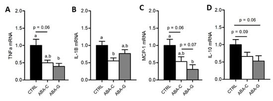 mRNA levels of colonic cytokines. The mRNA levels of colonic pro- and anti-inflammatory cytokines were evaluated by RT-qPCR for Gln experimentation: TNF-α (A), IL-1β (B), MCP-1 (C) and IL-10 (D). Column bar graphs showed control mice (CTRL; black bars, n = 16), non-supplemented activity-based anorexia mice (ABA-C; open bars, n = 16) and supplemented activity-based anorexia mice (ABA-G; grey bars, n = 12). Values without a common letter significantly differ (p < 0.05).