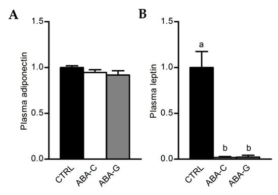 As Gln was able to specifically restore protein synthesis and paracellular permeability in the colon of ABA mice and as Gln was previously reported to regulate intestinal inflammatory response [40,41], we assessed in the Gln experiment the mRNA levels for pro- and anti-inflammatory cytokines in colonic samples. The ABA-C group exhibited a decrease in TNFα and IL-1β mRNA levels (Figure 5A,B). Gln supplementation did not affect the TNFα mRNA level but partially restored IL-1β mRNA expression. For MCP-1, we observed a trend for a decrease in mRNA levels in the ABA-C group that reached significance in the ABA-G group (Figure 5C). For IL-10, we observed a trend for a decrease of mRNA levels both in ABA-C and ABA-G groups (Figure 5D). ABA groups also exhibited a marked decrease in plasma leptin with no modification of plasma adiponectin (Figure 6A,B). However, Gln and BCAA supplementation did not affect plasma adipokine concentration.