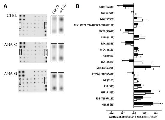 Colonic phosphorylation levels of proteins involved in signaling pathways. Phosphorylation levels of 17 proteins involved in the signaling pathway were evaluated by the MAPK array kit. Representative membranes are shown (A) for each group: CTRL, ABA-C and ABA-G, (n = 8 /group). Horizontal graph bar columns (B) show differential ratio levels in ABA-C (open bars) and ABA-G (black bars) compared to control mice. *: p < 0.05 vs. CTRL.