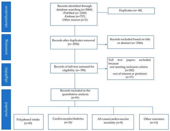 A literature search of all English language studies published was performed using PubMed (http://www.ncbi.nlm.nih.gov/pubmed), and EMBASE (http://www.embase.com/) databases (updated December 2018) with the addition of other scientific papers of relevance fount in web sources or in previously published reviews. The search terms and strategy used for the study selection were: polyphenols OR flavonoids OR anthocyanins OR flavanols OR flavanones OR flavones OR flavonols OR isoflavones OR proanthocyanidins OR phenolic acids OR hydroxycinnamic acids OR hydroxybenzoic acids OR lignans OR stilbenes AND intake. Human studies were used as further criteria of literature search. The search was limited to the last 10 years of publication. Three independent reviewers (S.B., M.M. and M.T.) conducted the literature search in the scientific databases and assessed and verified the eligibility of the studies based on the title and abstract. Disagreement between reviewers was resolved through consultation with a third reviewer (P.R. or C.D.B.) to reach a consensus. Inclusion criteria: (i) prospective, cohort and case-control studies analysing/estimating dietary total/classes/individual polyphenol intake; (ii) studies reporting association between dietary total/classes/individual polyphenol intake and endpoints of disease risk and mortality; (iii) studies published from January 2008 to December 2018. The exclusion criteria were: (i)-dietary intervention studies; (ii)-studies measuring polyphenols intake through urine excretion; (iii)-studies performed in in-vitro or in animal models; (iv)-studies reporting data on polyphenol intake from supplements (not food related); (v)-studies evaluating the association between polyphenol intake and cancer risk/mortality (numerous systematic reviews and meta-analysis have been recently performed); (vi)-published articles in a language different from English and with no accessible translation.