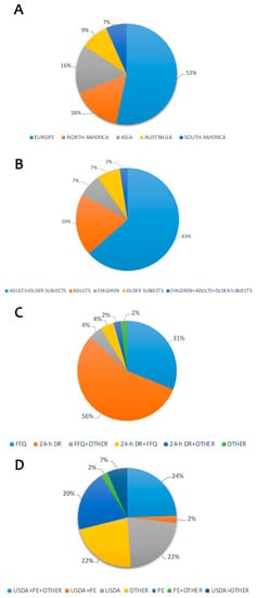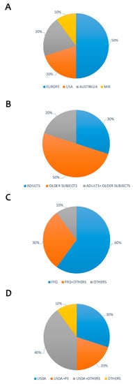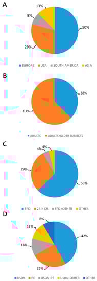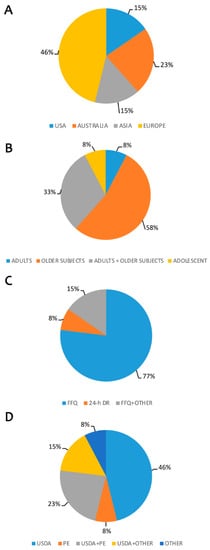Food intake was mainly assessed through FFQs (63%) or with 24-h DR (29%); 1 study adopted the FFQ in combination with other tools, while 1 study used other assessment methods (Figure 4C).