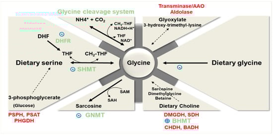 Glycine synthesis from the choline biosynthetic pathway [] is not predominant as dietary choline intake is very low (400–500 mg/d). However, this pathway is relevant because it also intervenes in the regulation of methyl donor availability, and consequently, in cellular methylation processes. Choline-dependent glycine biosynthesis involves the intermediary metabolites betaine (trimethylglycine), dimethylglycine, and sarcosine (N-methylglycine), as illustrated in Figure 1. The enzymes regulating the methyl transfers in the production of glycine from betaine are successively the cytosolic enzyme betaine-homocysteine S-methyltransferase (BHMT), and the mitochondrial enzymes dimethylglycine dehydrogenase (DMGDH) and sarcosine dehydrogenase (SDH). Interestingly, expression of BHMT, which catalyzes the methyl transfer from betaine to homocysteine to produce dimethylglycine and methionine, was shown to be upregulated in the liver of high-fat fed mice [,].