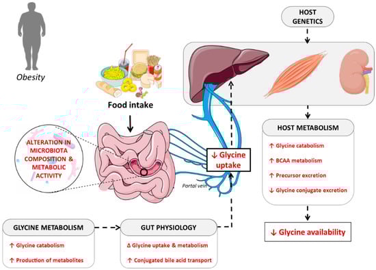 Potential mechanisms contributing to systemic glycine deficiency during metabolic diseases associated with obesity. Glycine dietary intake may not be the main determinant of glycine availability for the organism. Interactions between the food matrix and the intestinal microbiota influence the bacterial composition and metabolic capacity of the latter, thus modifying its ability to use glycine and produce metabolites derived from glycine. Alterations in glycine availability or microbial metabolites can modulate the expression of genes in intestinal compartments and impact the ability of the intestinal epithelium to take up glycine. Finally, interactions between the host genetics and physiology and the amount of glycine driven through the portal vein determine the fate of glycine, its bioavailability for the whole body, and its consequences on the host metabolism.