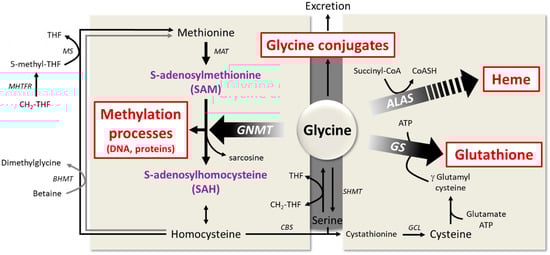 Glycine metabolism is a key regulator of methyl donors. In the liver, it participates in the regulation of the ratio between S-adenosylmethionine (SAM) and S-adenosylhomocysteine (SAH), as it is the substrate for the enzyme glycine-N-methyltransferase (GNMT) [,]. The main biological role of GNMT is to regulate the level of SAM, as it uses SAM and glycine to produce sarcosine. Since SAM is involved in methyl group transfer necessary for many biological processes and maintenance of the genetic stability [,], the regulation of GNMT activity is essential for metabolic homeostasis. In addition, GNMT promotes homocysteine re-methylation by the folate-dependent enzyme, methionine synthase, by increasing hepatic content in 5-methyl-THF [].