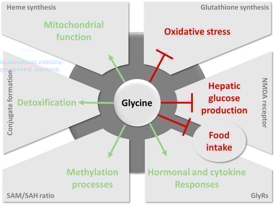 Main pathways involving glycine in health benefits. Metabolic benefits mediated by glycine include the inhibition of oxidative stress via increased glutathione biosynthesis, an inhibitory effect on gluconeogenesis and food intake via activation of the NMDA receptor, curbing the overload. Glycine also exerts positive effects on mitochondrial activity via heme biosynthesis, detoxification processes via urinary excretion of glycine conjugates, and regulation of hormonal (enhanced secretion of key hormones in glucose homeostasis) and cytokine (reduced production of pro-inflammatory cytokines) responses via activation of GlyRs. Finally, glycine impinges the SAM biosynthetic process, decreasing the availability of methyl-donors, and thus regulating methylation. Favorable pathways induced by glycine are green; the harmful pathways inhibited by glycine are red. Note: NMDA = N-methyl-D-aspartate; GlyRs = glycine receptors; SAM = S-adenosylmethionine; SAH = S-adenosylhomocysteine.
