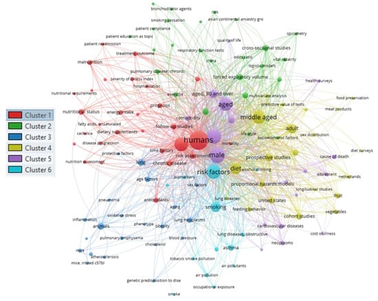 There is an expanding literature on the topic regarding diet–COPD relation. A literature search performed with the PubMed database to identify papers with the following terms “diet” and “chronic obstructive pulmonary disease risk” retrieved 233 manuscripts (from 1989 to 2019). The resulted manuscripts were analyzed using the bio-informatic data analysis tool VOSviewer [22], which extracts and analyzes the words in the titles and abstracts of the publications, relates them to citation counts, and visualizes the results as a bubble or term map, based on the strength of the co-occurrence links within the terms. The terms with greatest total link strength were selected and highlighted as bubbles. The analysis returned 750 words, of which 127 met the threshold levels (minimum number of occurrence of a term = 5). As shown in Figure 1, diet has been the focus of relevant scientific attention, and several of the words retrieved from the analysis were connected to diet, feeding behaviors, and specific foods and nutrients (fruits and vegetables, antioxidants, unsaturated fatty acids, meat products), suggesting some of the main key research categories that have been the attention focus in the topic diet and COPD risk.