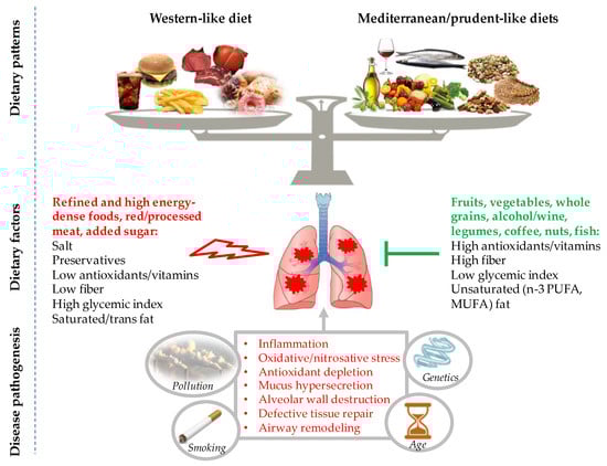 A cohort study in Chinese Singaporeans found that the meat–dim sum dietary pattern (red meat, preserved foods, rice, noodles, deep-fried foods) was associated with an increased incident cough with phlegm (odds ratio (OR) = 1.43 comparing fourth to first quartile, p for trend = 0.02) [146], indicating a deleterious effect of a diet rich in meat, starchy foods, and high-fat dairy products on respiratory symptoms. Two prospective studies in US health professionals identified two distinct major dietary patterns, the “prudent pattern”, loaded by a high intake of fruits and vegetables, oily fish, poultry, wholegrain products, and low-fat dairy products, and the “Western pattern”, characterized by a high consumption of refined grains, cured and red meats, desserts, French fries, and high-fat dairy products [147,148]. Both studies consistently found that the “prudent” pattern was negatively and the Western pattern positively associated with the risk of self-reported newly diagnosed COPD in women [148] and men [147] after adjustment for several potential confounders, including measures of tobacco exposures. In contrast with findings for COPD, the dietary patterns were not associated with the risk of adult-onset asthma. Notably, the effect of each dietary pattern was stronger in men than in women [147,148]. For the prudent pattern, the relative risk (RR) for highest vs. lowest quintile was 0.50 (p for trend = 0.02) in the men cohort [147], and 0.75 (p for trend = 0.02) in the women cohort [148]. For the Western pattern, the RR for highest vs. lowest quintile was 4.56 (p for trend <0.001) in the men cohort [147], and 1.31 (p for trend = 0.02) in the women cohort [148]. As several individual foods of the “prudent” or the “Western” diet might be related to COPD, as discussed in previous paragraphs, the “prudent” and the “Western” diet patterns reflect the possible combinatory effects of these diverse but highly correlated foods.