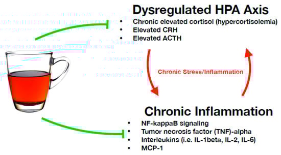 Within a typical HPA axis response, the acute stressor will pass, and stress hormone cortisol will exert a negative feedback effect on the stress circuit by down-regulating CRH synthesis in the hypothalamus. However, unresponsiveness to cortisol’s negative feedback signaling, or periods of constant perceived stress will cause the stress circuit to operate continuously, a physiological state referred to as HPA axis hyperactivity. Under such conditions, the limbic system is over-stimulated, leading to a condition of “learned helplessness”, in which the overwhelmed subject loses motivation and detaches from external engagement, at which point in humans, depressive symptoms are reported and MDD is often diagnosed. Furthermore, with HPA hyperactivity, the hippocampus becomes desensitized to constant elevated levels of CRH, causing the body to release more cortisol in an attempt to down-regulate CRH production. The elevated cortisol causes more stress and inflammation, in turn triggering the release of more cortisol, and the stress circuit becomes a positive feedback loop of neuropathology (Figure 2). Over time, chronic elevated stress hormone levels deteriorate important neural networks in the brain, including monoaminergic and limbic systems, and reduce hippocampal volume and neuroplasticity. As discussed below, these downstream effects can further exacerbate MDD neuropathology and symptomology. For these reasons, some have described MDD to be nearly synonymous with dysfunctional HPA axis activity [29,30]. This section reviews in vitro and in vivo studies measuring how the bioactive constituents in tea have been observed to affect HPA axis activity under stressful conditions, including the mechanistic explanations proposed for the observed effects (summarized in Table 1).