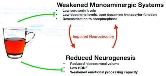 The positive feedback loop of weakened monoaminergic systems and reduced neurogenesis. Weakened monoaminergic systems and reduced neurogenesis represent two mechanistic nodes within an interrelated system of depression pathology. Bullet points identify symptoms of weakened functional status, and key targets for tea phytochemicals. Green lines represent attenuating effect, while red lines represent exacerbating effect. BDNF, brain-derived neurotrophic factor.