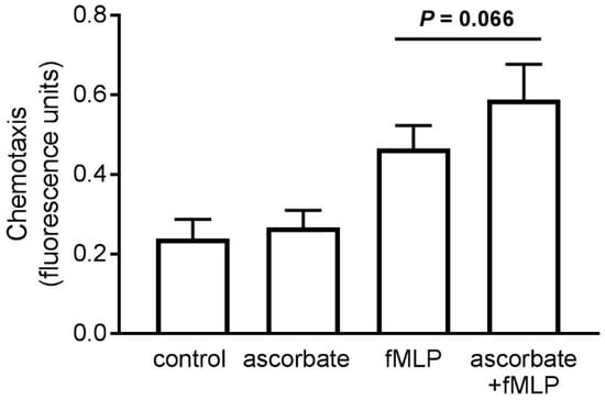 We also measured the effect of extracellular ascorbate on the directional motility of neutrophils. We found that adding ascorbate (100 µmol/L) to the lower compartment further enhanced fMLP-stimulated directional motility of the cells, although this did not quite reach statistical significance (Figure 3).