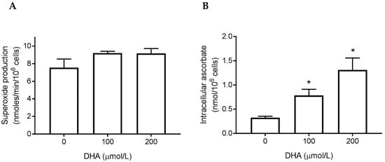 The effect of ascorbate uptake on superoxide generation by stimulated neutrophils. (A) Cells pre-loaded with DHA were stimulated with PMA (100 ng/mL) and the rate of superoxide generation measured over 5 min. (B) The intracellular ascorbate concentration of preloaded cells was measured by HPLC. Data represent mean ± SEM, n = 3. * p < 0.05.