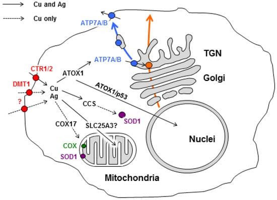 Scheme of copper and silver distribution in a mammalian cell. Copper is taken up via copper transporter 1 (CTR1), divalent metal transporter 1 (DMT1), or the putative transporter (all depicted as red circles). After being imported into the cell, the copper is transferred to chaperone antioxidant protein 1 (ATOX1), copper chaperone (CCS), and cytochrome-c-oxidase (COX17), which ferry it (black arrows) to both copper-transporting ATPase (ATP7A/B, blue) in the Golgi, to Cu, Zn-superoxide dismutase (SOD1, magenta) in the cytosol, and to cytochrome-c-oxidase (COX, green) in the mitochondria. Mitochondrial phosphate carrier protein (SLC25A3) transfers copper into the matrix. In the Golgi, ATP7A/B load Cu on newly synthesized cuproenzymes (orange circle), which transport it along the biosynthetic pathway (orange arrow). A significant increase in intracellular Cu induces the export of ATP7A/B (blue arrow) toward the post-Golgi compartments (TGN) and plasma membrane, where it drives the excretion of excessive Cu from the cell. Silver uses similar copper-transporting routes (solid black arrows). However, several copper-transporting pathways cannot be invaded by silver (dashed black arrows).