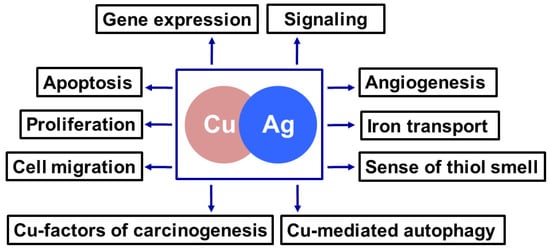 A growing body of evidence suggests that silver treatment could be of value for various medical purposes. For example, silver might modulate the efficiency of cisplatin chemotherapy, which is widely used to treat solid tumors. As in the case of copper and silver ions, cisplatin uptake into the cells requires CTR1. Thus, modulation of copper status (also with silver) has been considered as an option for the acceleration of cisplatin influx into the cells [,,]. Indeed, it was recently shown that an Ag diet can be successfully used for this purpose []. One of the general signs of tumor development, regardless of its nature, is increased copper consumption, which is manifested in the activation of copper metabolism genes []. In this context, Ag(I) might interfere with cuproenzyme synthesis and angiogenesis, which both require copper to promote tumor growth. In line with this notion, a diet including Ag was shown to inhibit the growth of human tumors engrafted into nude mice [].