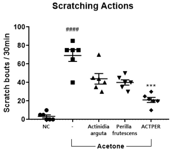 Anti-pruritic effects of Actinidia arguta, Perilla frutescens and ACTPER in acetone-treated mice. Effects of water-soluble extracts from Actinidia arguta, Perilla frutescens, and ACTPER (200 mg/kg) on acetone-induced itch were determined as described in the Materials and Methods section. n = 6 per group. All data are shown as mean ± S.E.M. #### p < 0.0001 compared with control group; *** p < 0.001 compared with vehicle group.
